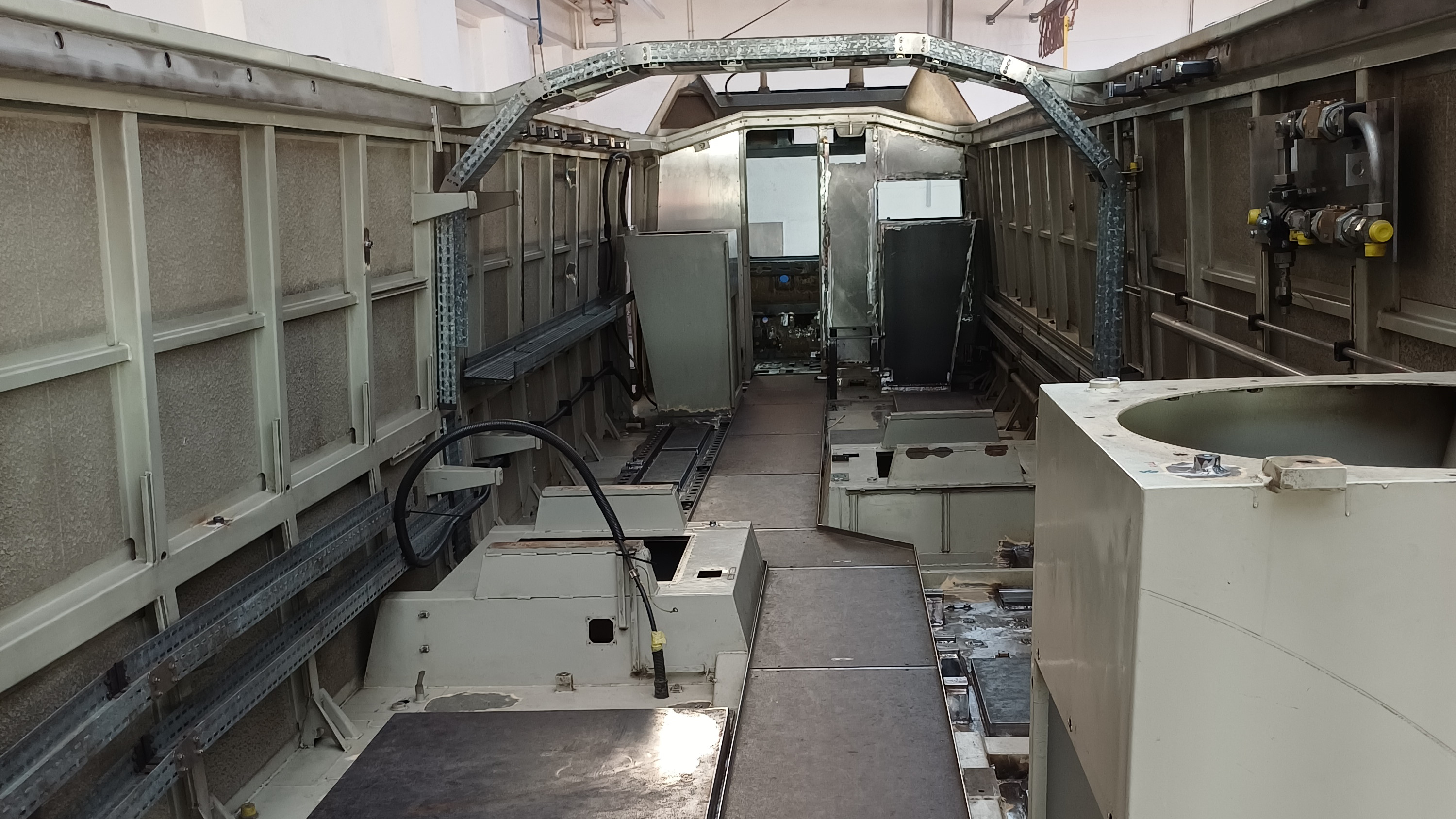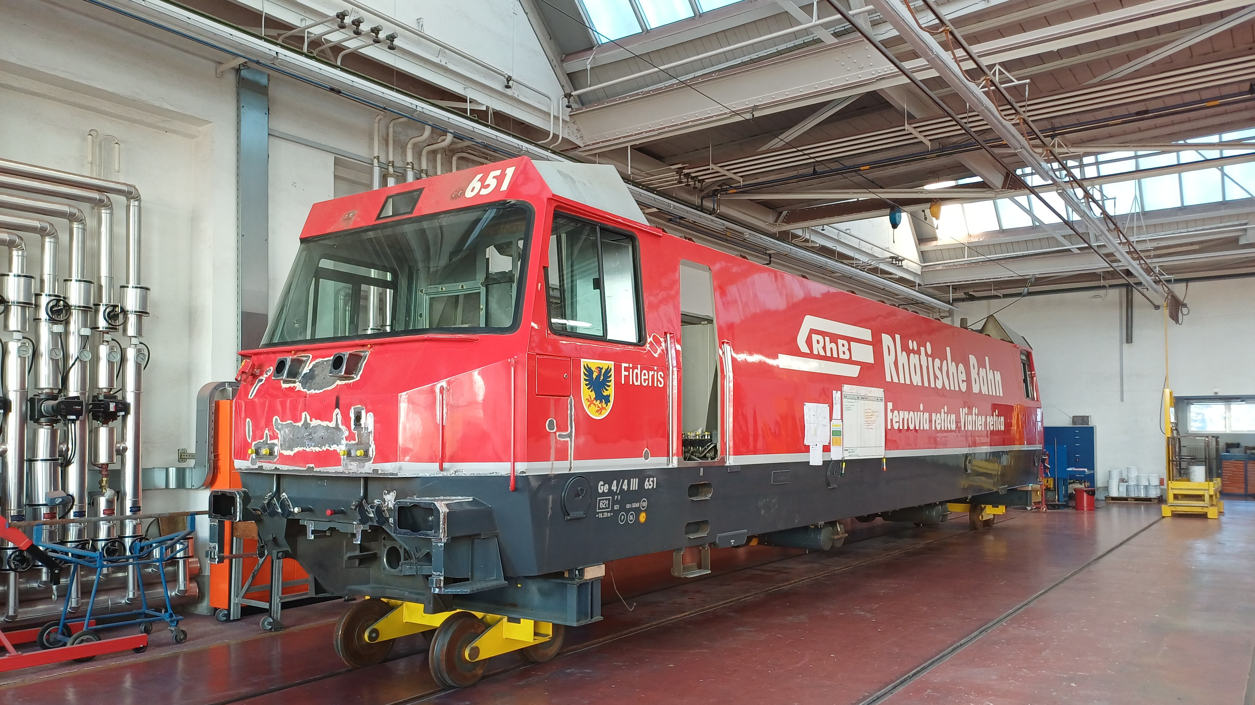 Die Ge 4/4III 651 steht komplett leergeräumt in der Werkstatt.