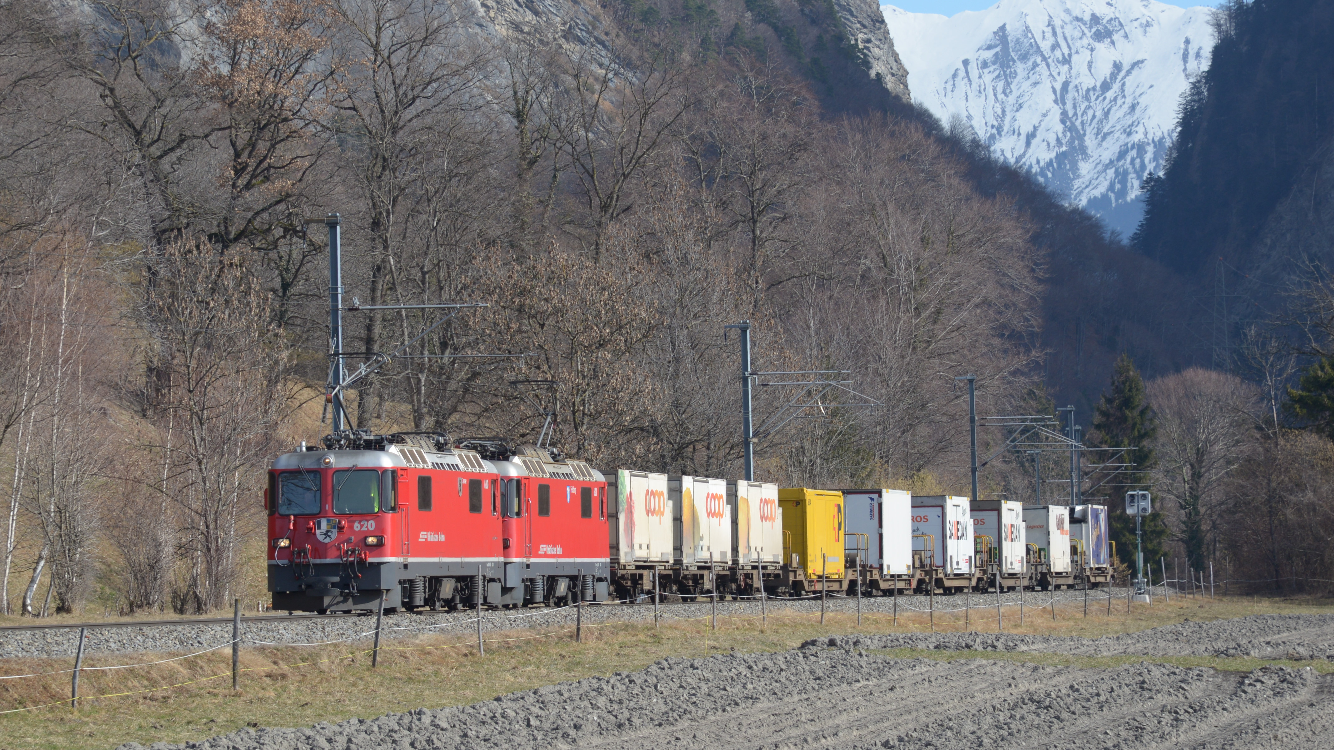 Die Ge 4/4II 611 mit Güterzug 5143 in Rodels-Realta.