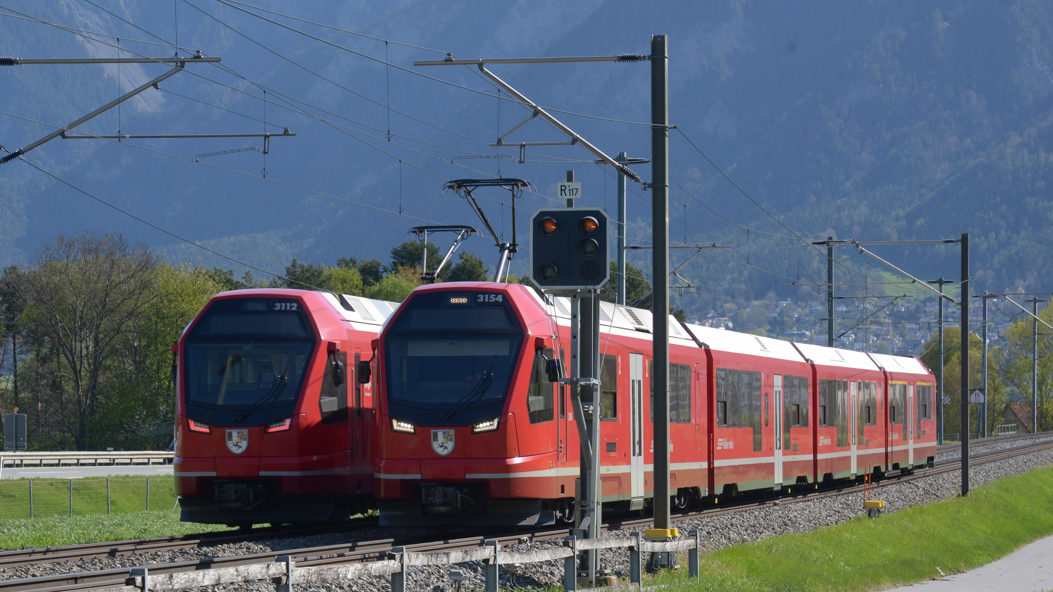 Der ABe 4/16 3154 "kreuzt" den 3112 der Gegenrichtung, bei Felsberg.
