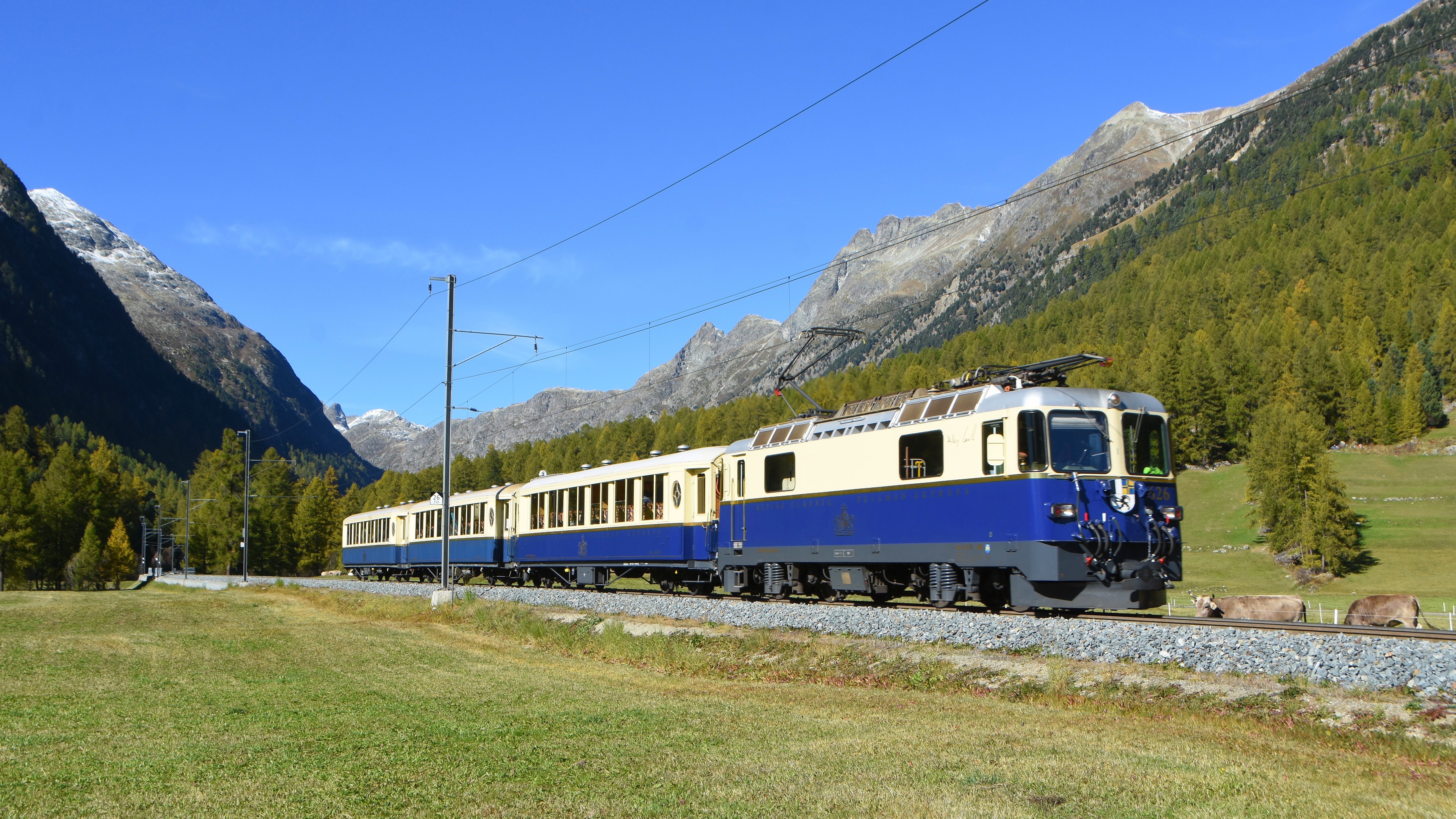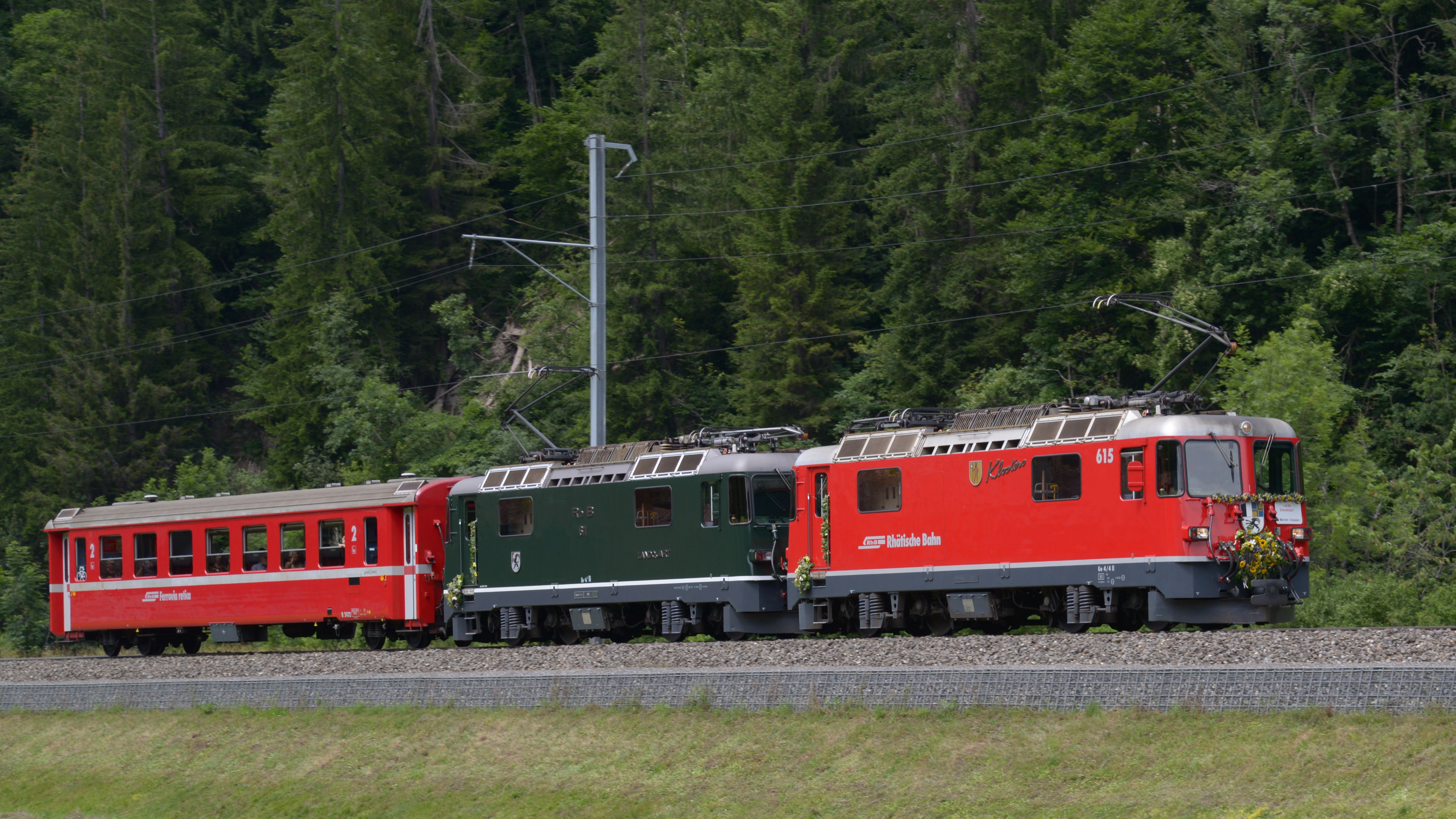 Die Ge 4/4II 626 mit einem Extrazug im Val Bever.