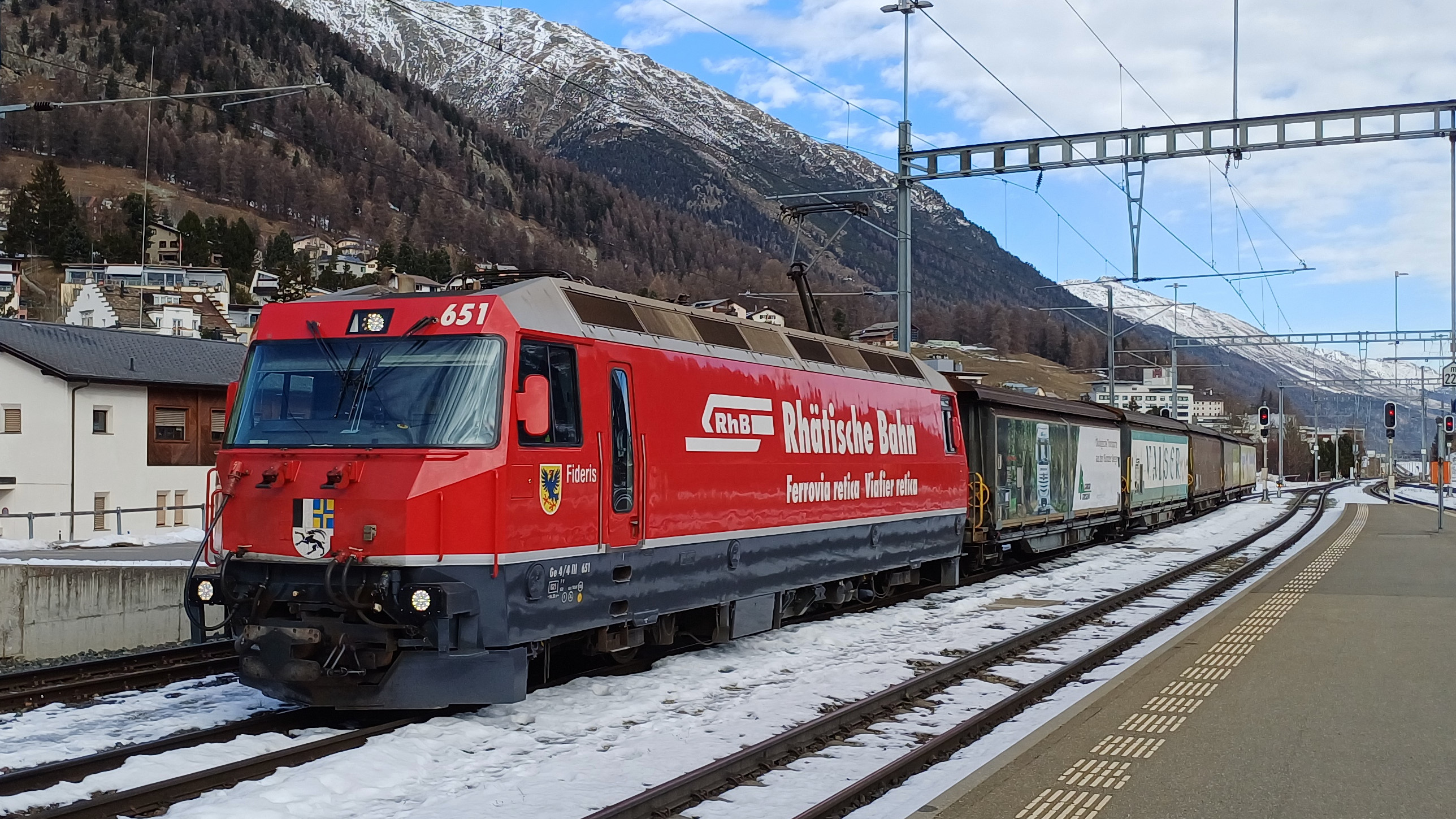 Die Ge 4/4III 651 fährt in Samedan ein.