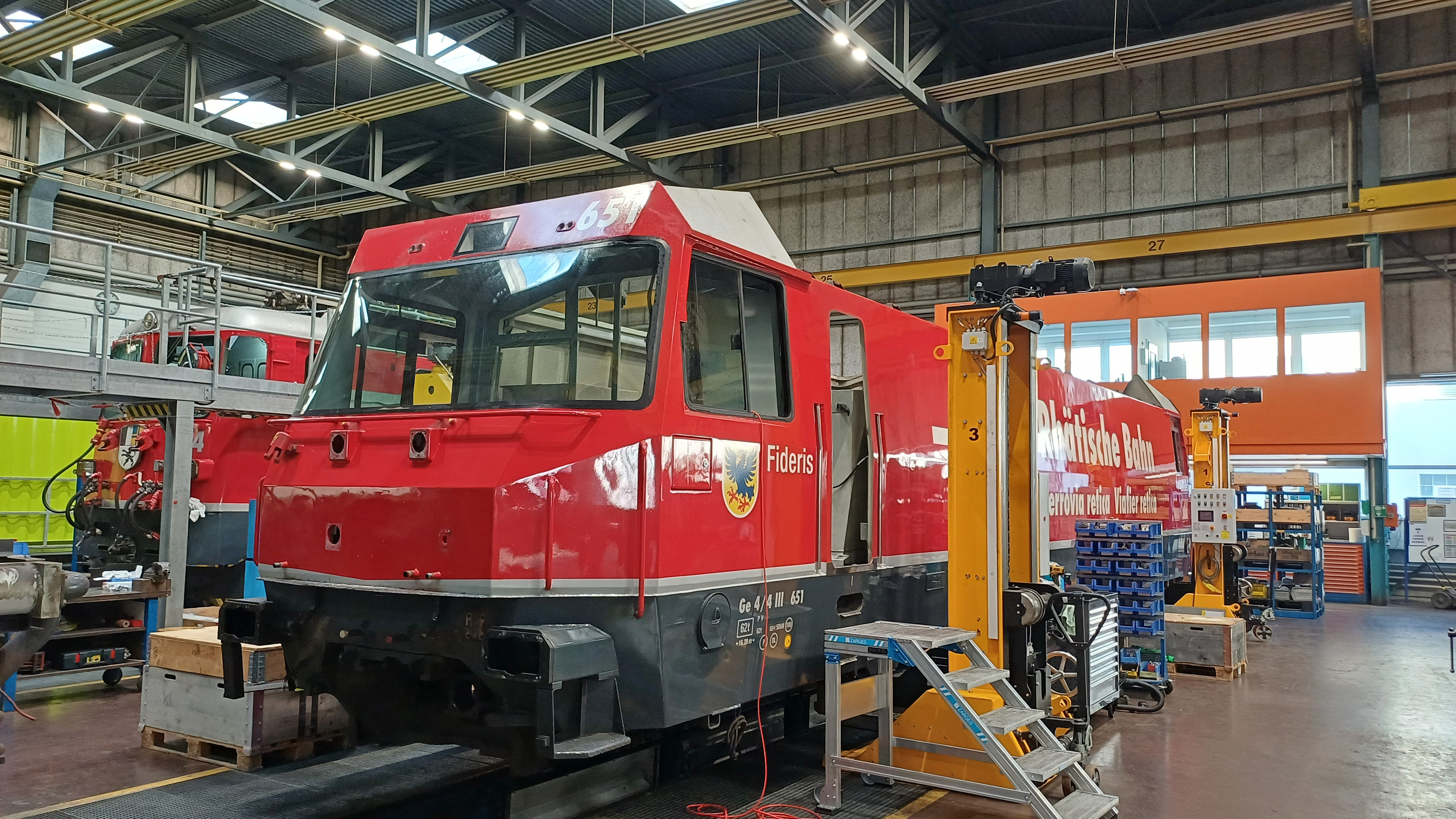 Die Ge 4/4III 651 steht komplett leergeräumt in der Werkstatt.