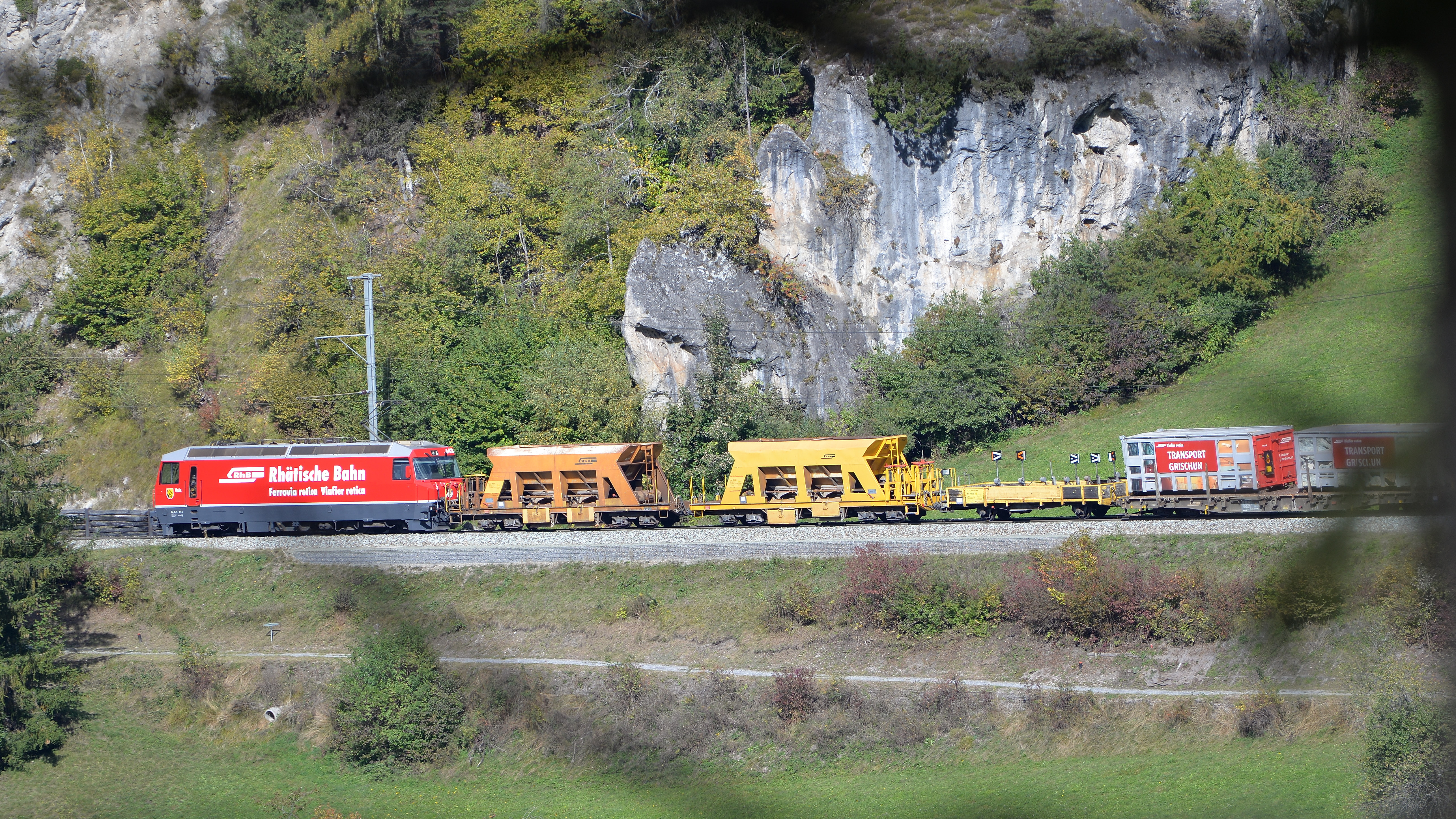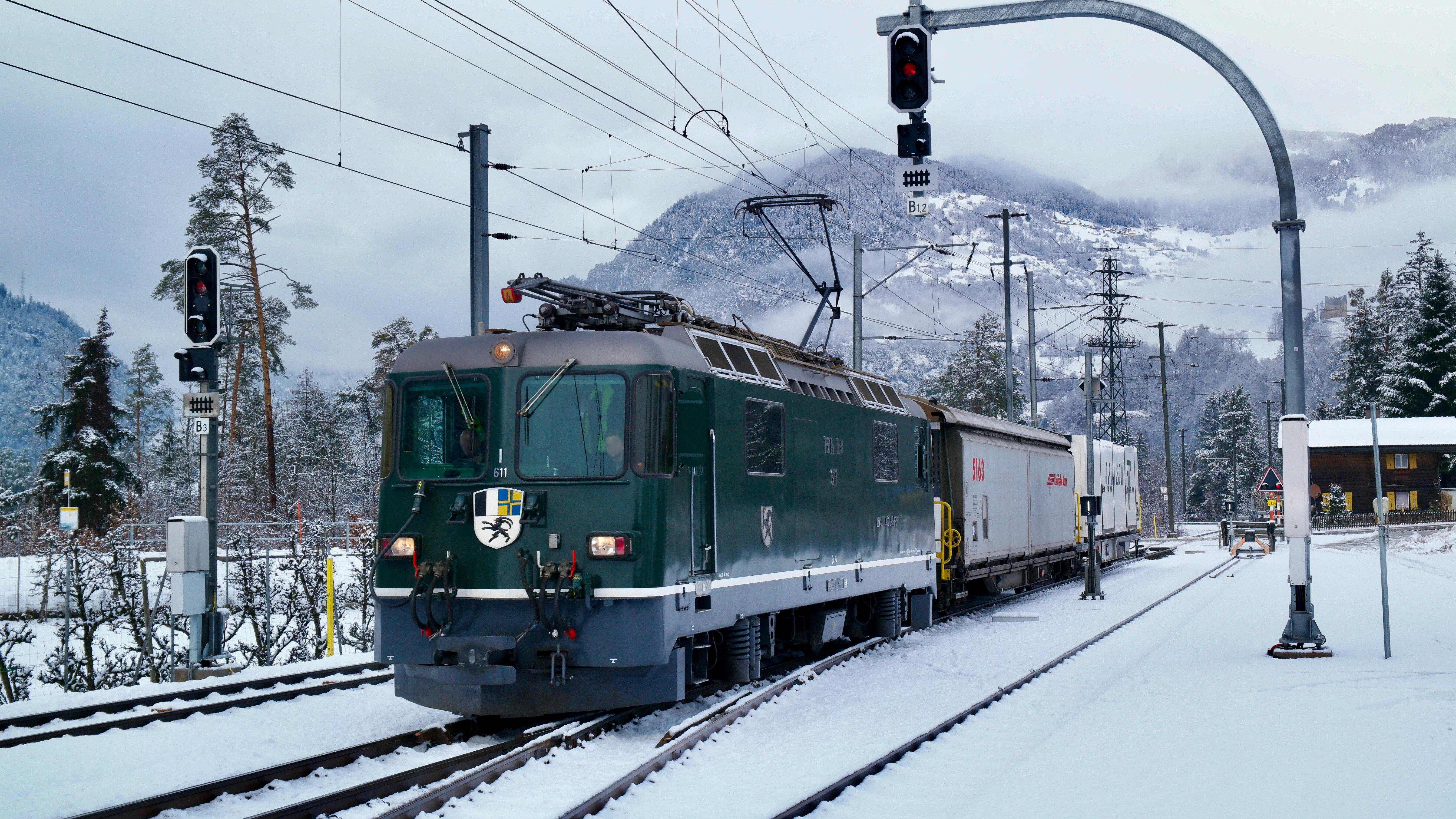 Die Ge 4/4II 611 mit Güterzug 5143 in Rodels-Realta.